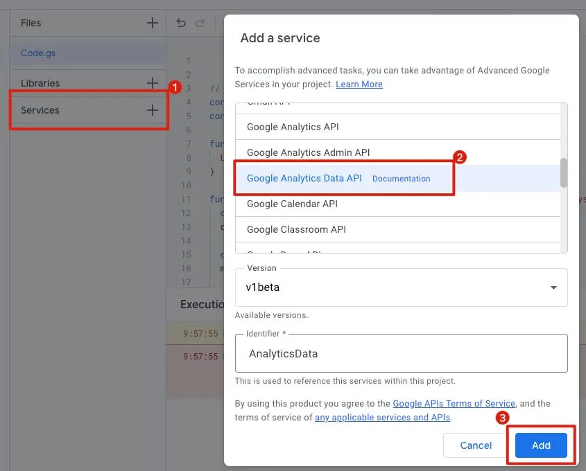 在左方的「Services」点「+」加上「Google Analytics Data API」。
