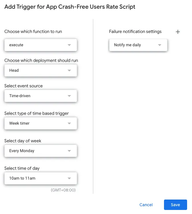 p.s. 不同于上一篇使用 Big Query 需要花钱查询资料,此篇查询 Crash-Free Users Rate、Google Apps Script 都是完全免费,可以放心使用。