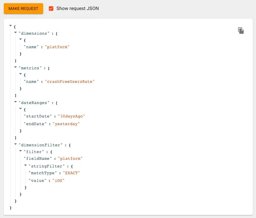 拉到最下面点击「Make Request」查看结果,我们就能得到指定日期范围内的 Crash-Free Users Rate。