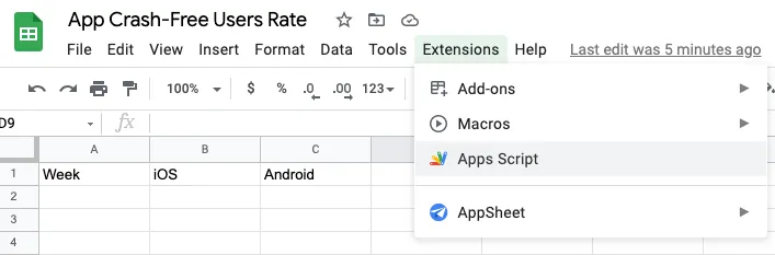 再来就是自动化的部分,我们将使用 Google Apps Script 查询 GA Crash-Free Users Rate 数据后自动填入到我们的 Google Sheet 表单;已达自动填写、自动追踪的目标。