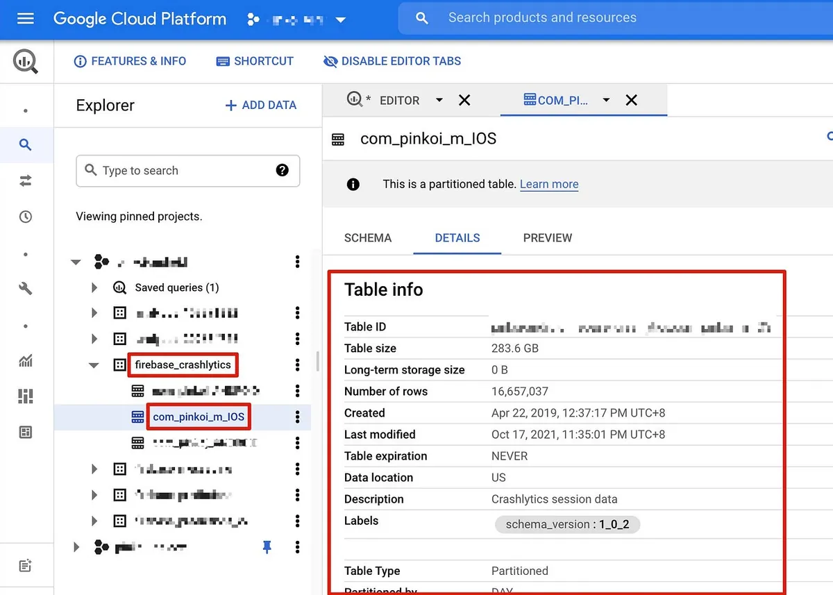 前往 GCP -> Big Query 后可在左方「Exploer」中选择「firebase_crashlytics」->选择你的 Table 名称 ->「Detail」 -> 右边可查看 Table 资讯,包含最新修改时间、已使用容量、储存期限…等等。