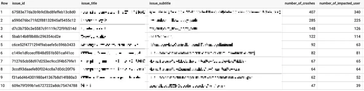 但官方范例这个下法查出来的资料跟 Crashlytics 看到的排序不一样,应该是它用 blame_frame.file (nullable), blame_frame.line (nullable) 去 Group 的原因导致。