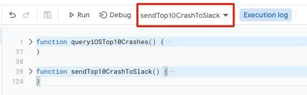 接下来请在上方的选择「sendTop10CrashToSlack」Function,然后点击 Debug 或 Run 执行测试一次;因第一次执行需要完成身份验证,所以请至少执行过一次再进行下一步。