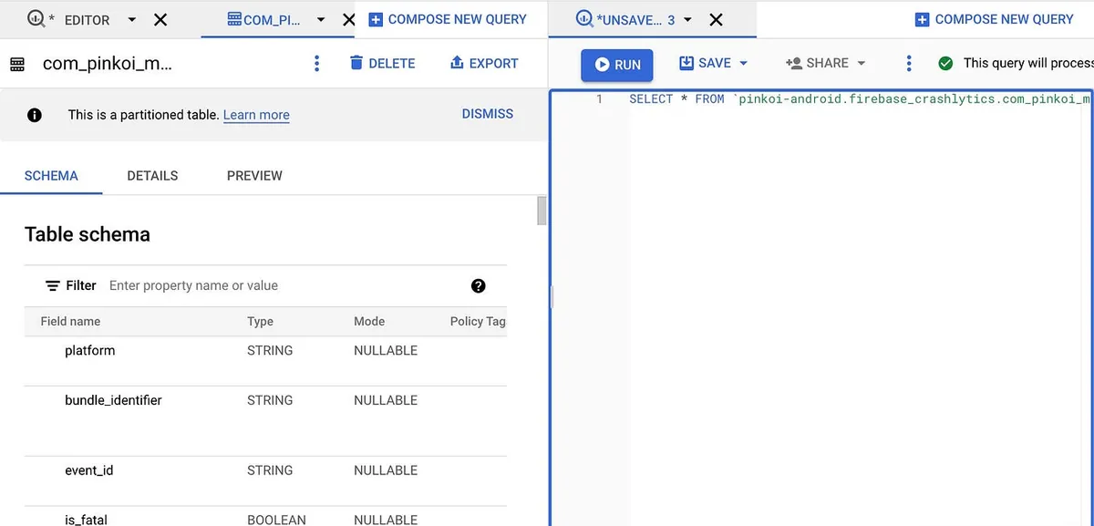 设好 Crashlytics Log to Big Query 汇入周期&完成第一次汇入有资料后,我们就能开始查询资料啰。