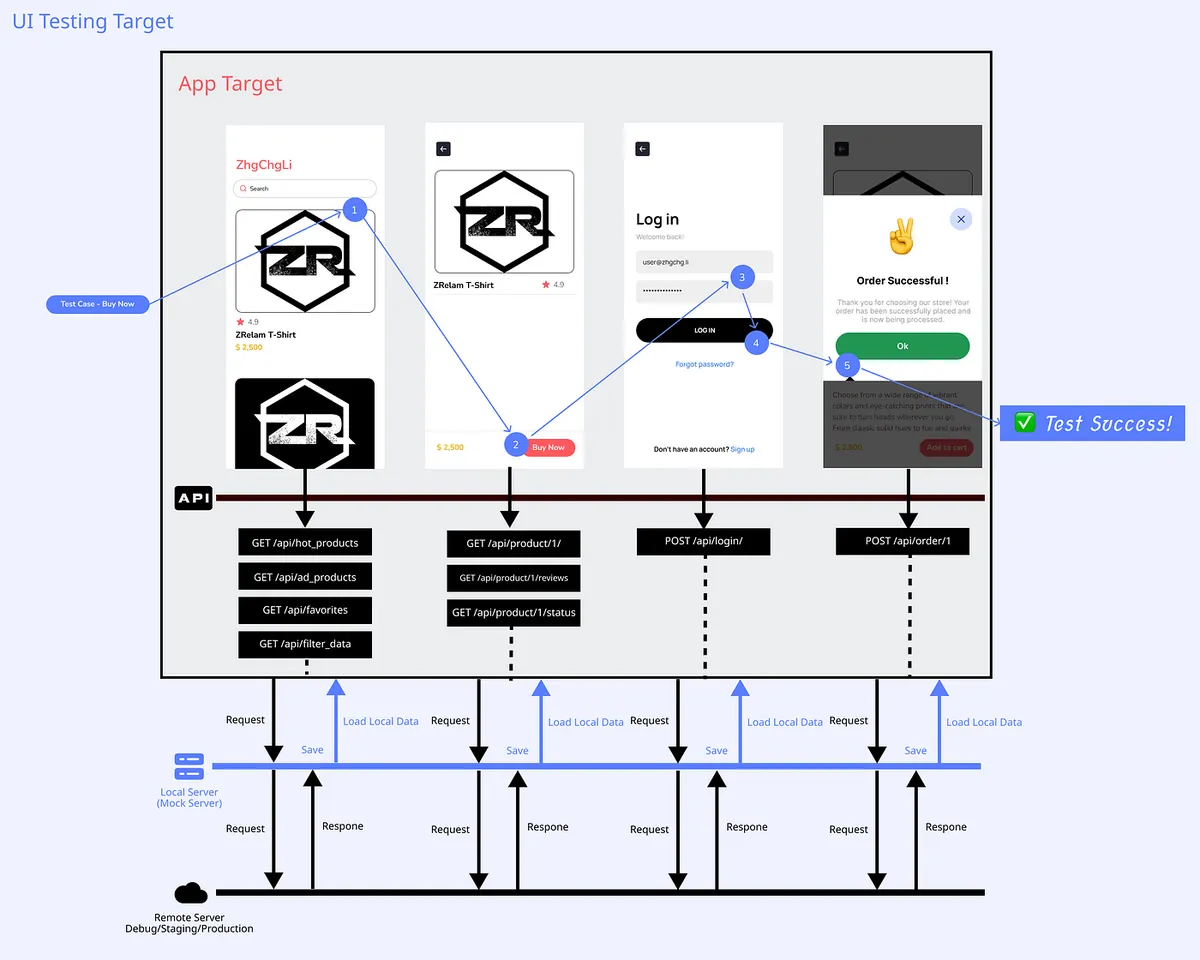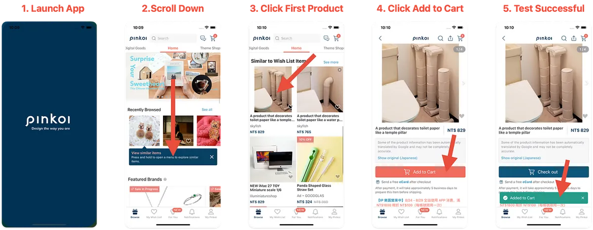 假设我们要测试加入购买流程,使用者打开 App 后在首页点击商品卡进入商品详细页,按底部购买,跳出登入匡完成登入,完成购买,跳出购买成功提示:
