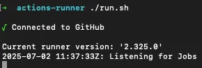 出现 √ Connected to GitHub、Listening for Jobs 就代表已经在监听 Actions 任务了: