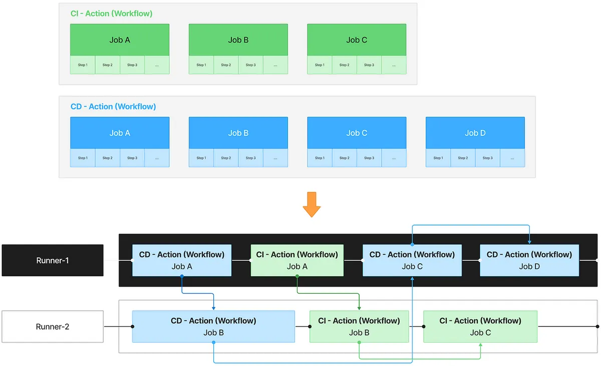 只关心 Job 不关心是哪个 Action(Workflow) 因此会出现 Action A 的 Job-1 执行完,下一个换 Action B 的 Job-1,而不是 Action A 的 Jobs 都执行完才换 Action B。