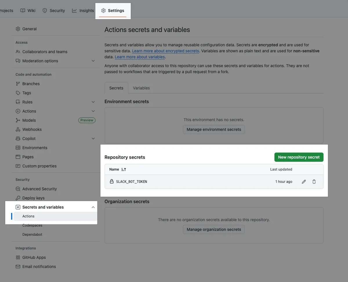 Repo → Settings → Secrets and variables → Actions → Secrets。