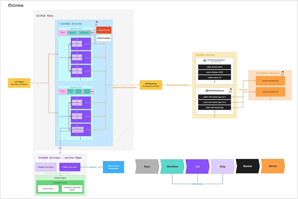 在开始之前我们先来确定一下 GitHub Actions 的运作架构流程关系与职责。