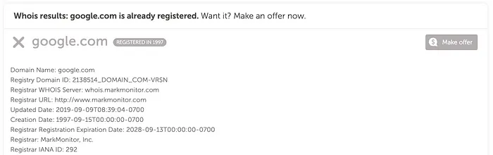 如果右边按钮显示「 Make offer 」、「 Taken 」代表该域名已被注册,请选择其他后缀或换个域名: