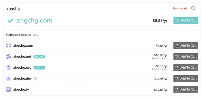 右边按钮显示「 Add To Cart 」代表该域名还没有人注册,可以加入购物车购买。