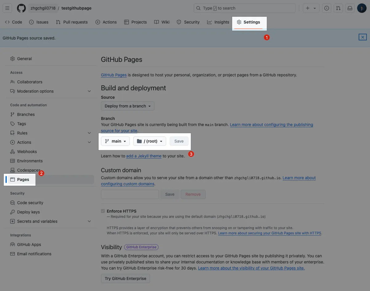 如为非 你的帐号.github.io 的主 Github Pages Repo,需要再去 Settings 设定 Pages 才能启用 GitHub Pages: