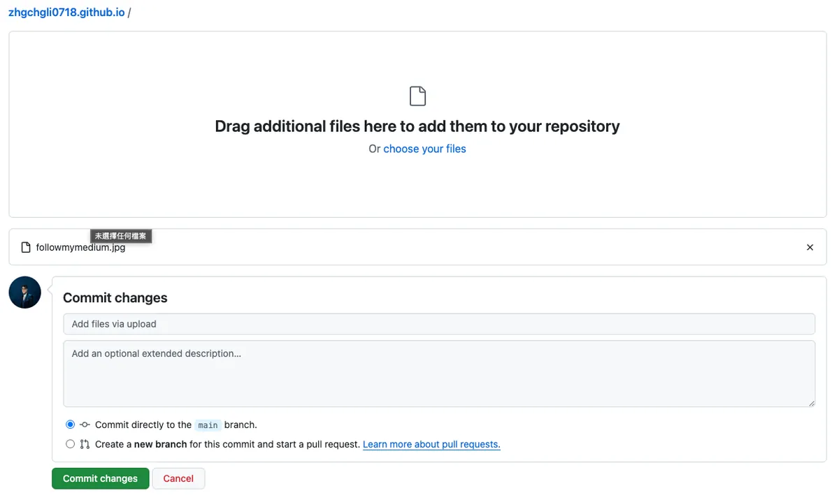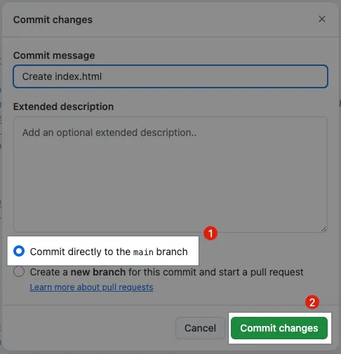 - 选择「Commit directly to the main branch」