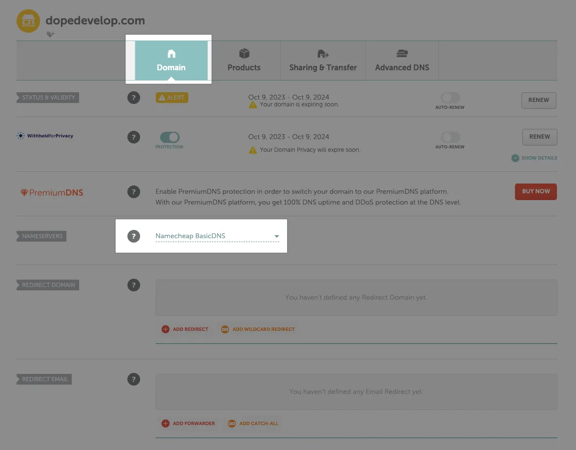 确定 Domain -> NAMESERVERS -> 选择「Namecheap BasicDNS」:
