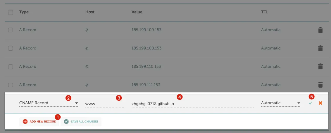 3. 依照想设定的 Github Pages Repo 加入 CNAME Record: