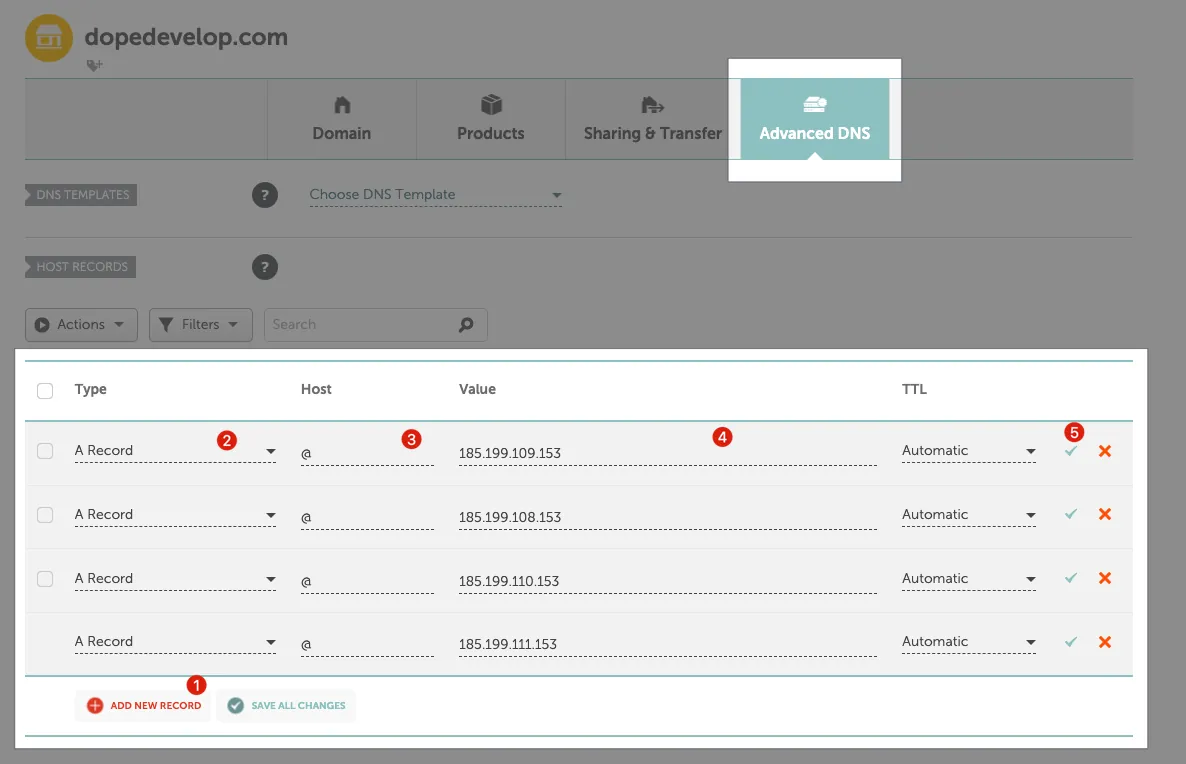 切换到「Advanced DNS」-> 加入 A Record: