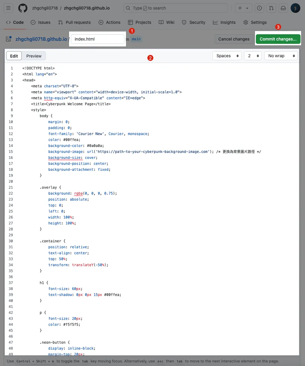 index.htmlEdit:贴上 ChatGPT 产生的 .html 内容,可以使用 ChatGPT 调整你要的 html 或是直接在这边编辑 HTML 内容