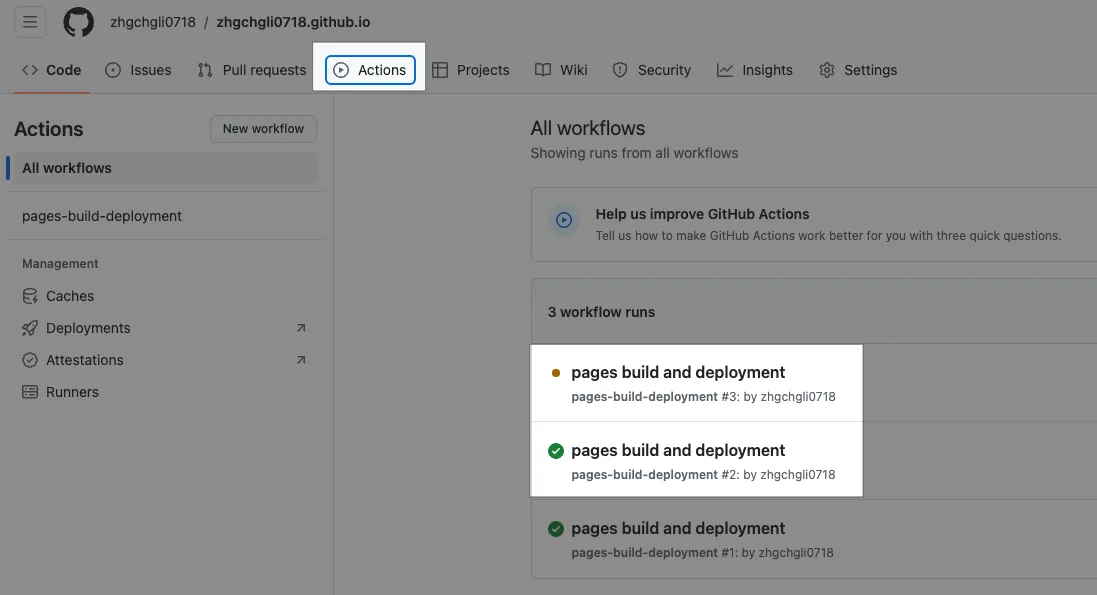 如同前述,Github Pages 需要部署,不是存档就会出现;我们可以点 Repo 上方的「Actions」查看部署进度,直到橘灯🟠变成绿色勾勾✅代表部署完成了。