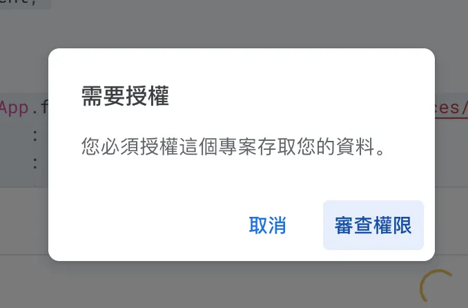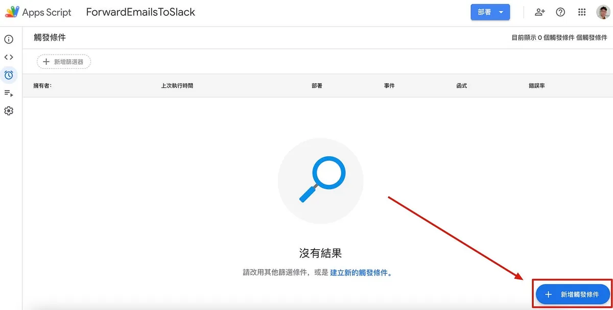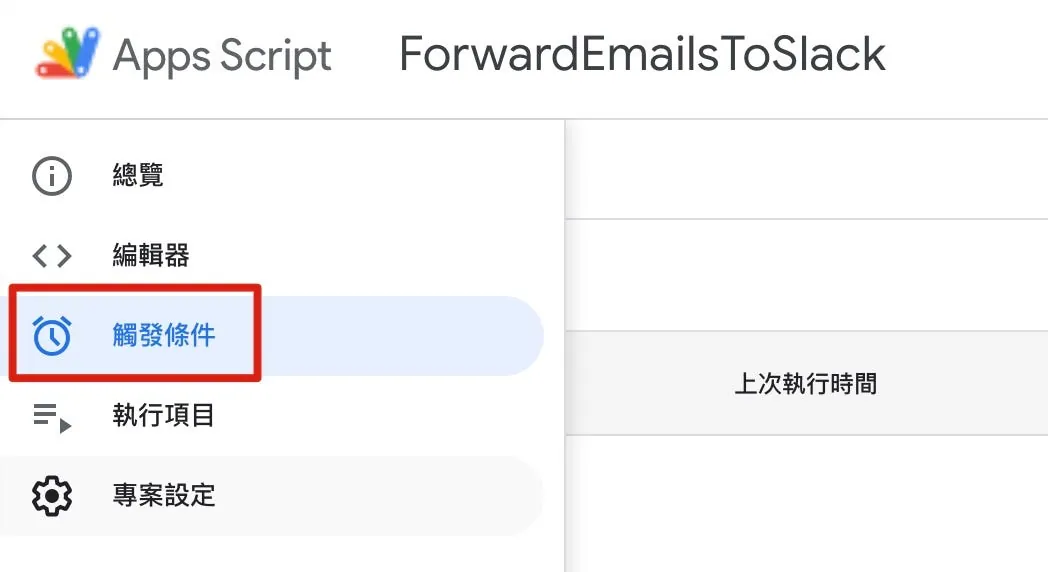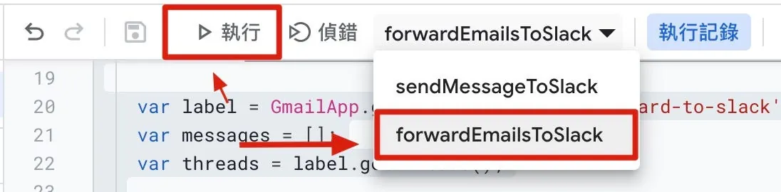 在 Apps Script 程式码编辑器上选择「forwardEmailsToSlack」然后点击「执行」按钮