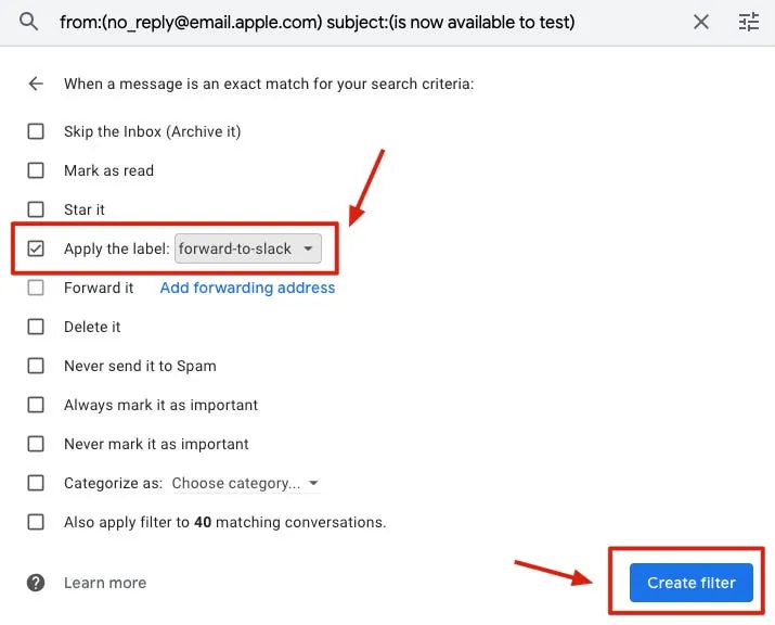 下一步设定符合此筛选条件是的动作,这边我们选「Apply the label」建立一个独立新辨识用 Label 「forward-to-slack」,点击「Create filter」完成。