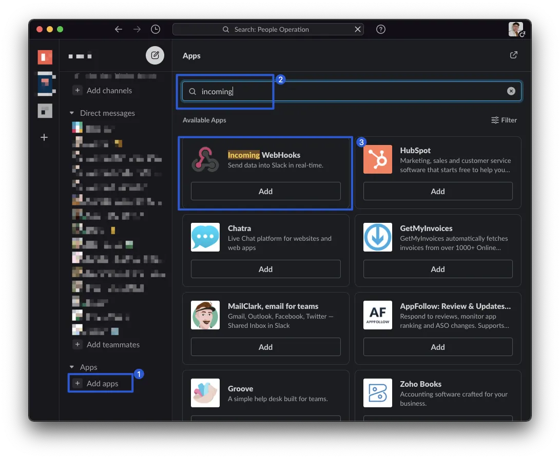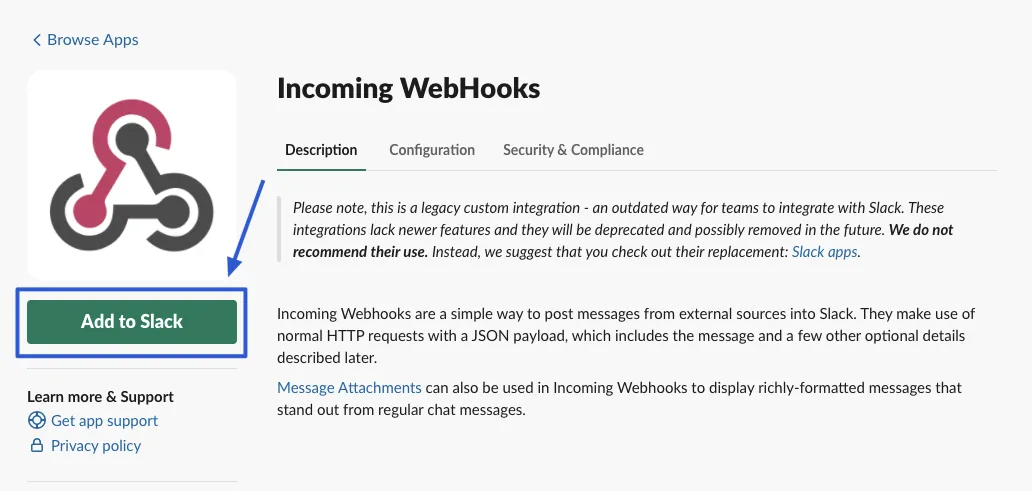 首先我们要加入 Incoming WebHooks App 到 Slack Channel,我们会透过此媒介来传送讯息。