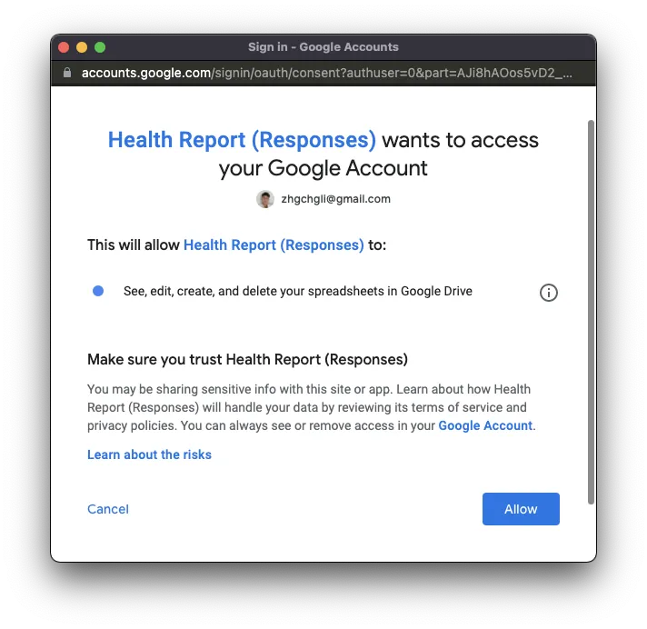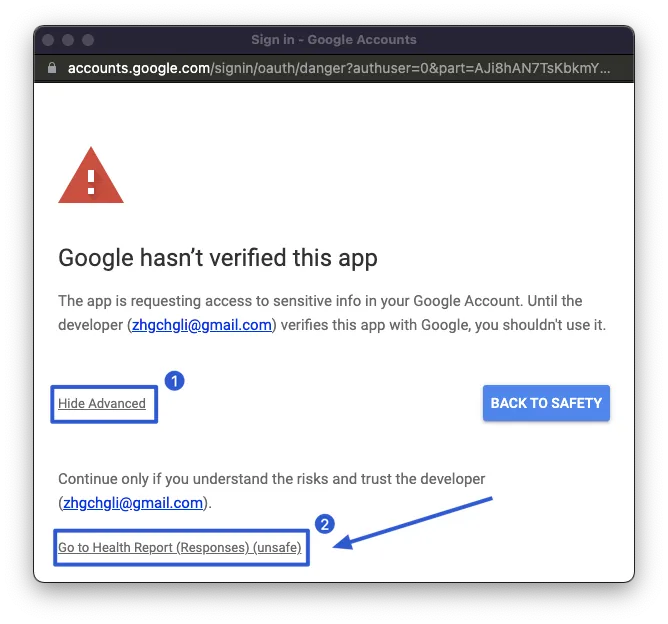 在身份验证的过程中会出现「Google hasn’t verified this app」这是正常的,因为我们写的 App Script 没有经过 Google 验证,不过没关系这是写给自己用的。