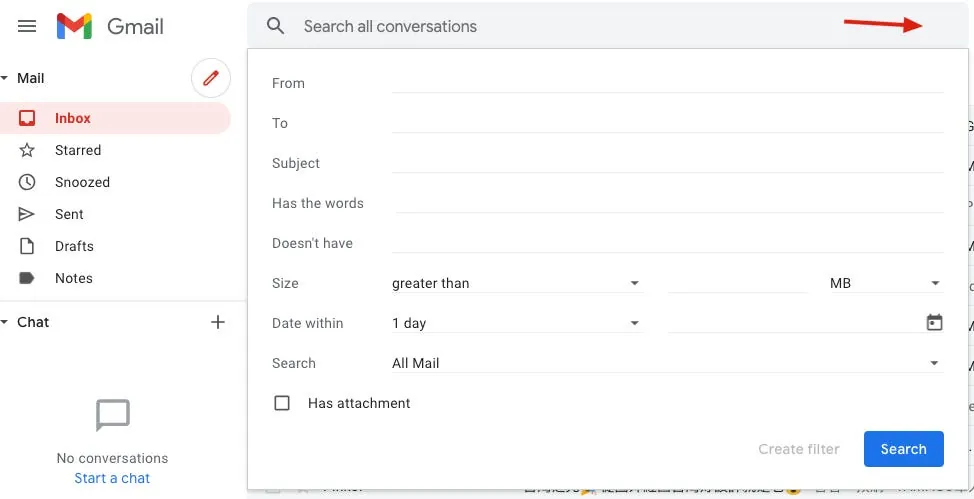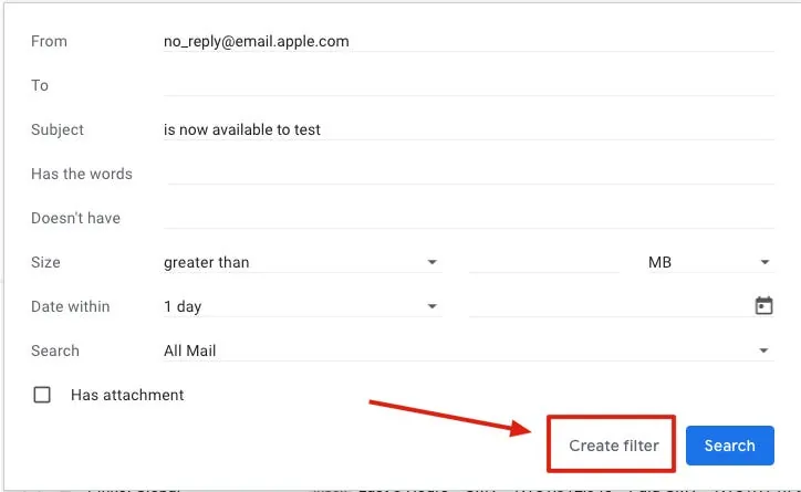 在 Gmail 点击右上进阶搜寻图标按钮,输入要转发的信件规则条件,例如来自: [email protected] + 主题是 is now available to test. ,点击「Search」查看筛选结果是否如预期;如果正确可以点击 Search 旁的「Create filter」按钮。