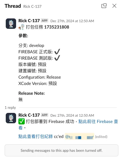 另外,我们可以用使用者的信箱透过 Slack App 去打 Slack API,取得该使用者的 Slack ID,再透过 Slack App 传送讯息,通知 CI/CD 任务执行情况。