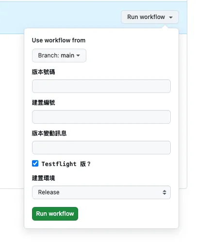 不同于 Jenkins 是自建服务,有完整的 Web GUI;Github Action 没有,唯一的 Web GUI Form 是在 Actions 中点击 Run workflow 可以自订一个简易的表单供使用者输入外部参数,然后触发 CI/CD 工作流程。