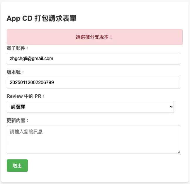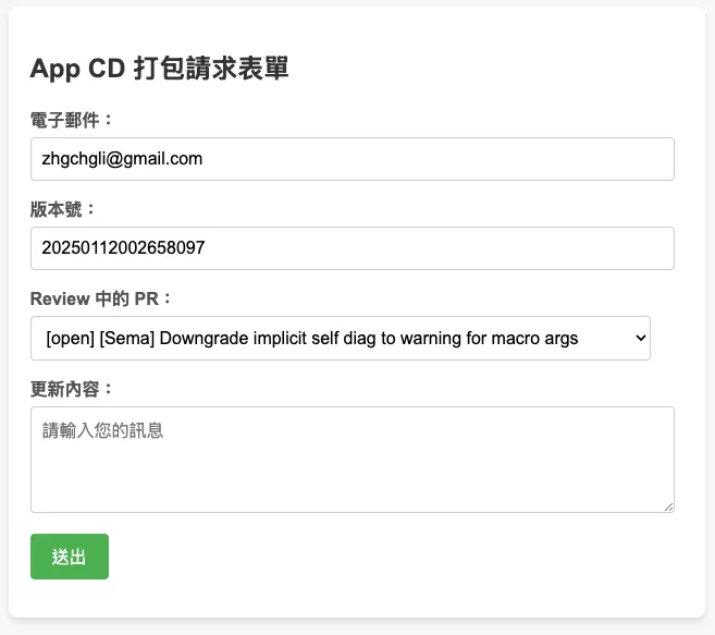 我们使用 Google Apps Script Web App 建置 CI/CD 表单,直接绑定 Google Workspace 帐号,设定只有组织内的使用者可以存取;自动获取当前登入的使用者信箱、使用 Github Repo 共用帐号(或借用某个有权限的帐号)的 Personal Access Token 打 Github API 获得分支列表,送出后同样打 API 触发 Github Action 开始执行 CI/CD 工作。
