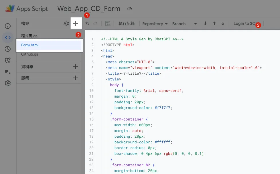 在 GAS 左方档案列表点「+」新增档案,输入档案名称「 Form.html 」并把 GPT 产的 HTML 表单范本内容贴上。