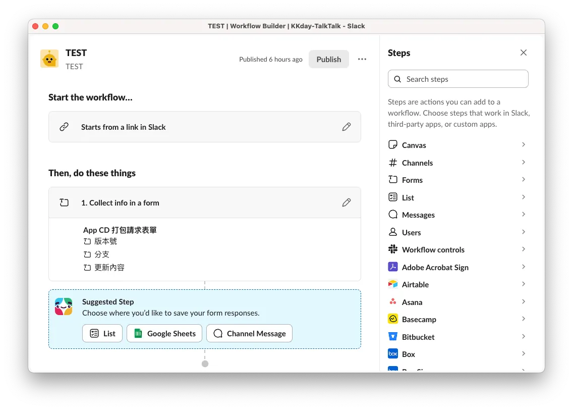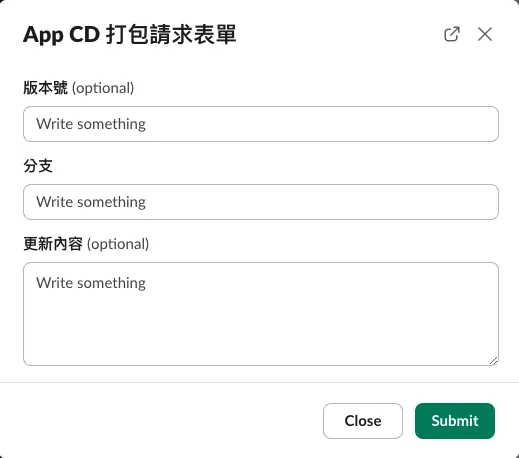 另外也尝试过 Slack 内建的自动化功能 Workflow Form,不过他无法做到动态表单内容 (e.g. 捞分支让使用者选),唯一能客制化的只有后续送资料的步骤。