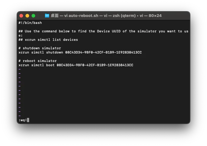[Device UUID]替代成你想用的模拟器 Device UUID记得如果模拟器有更换要改这个脚本的 Device UUID,否则就无效了