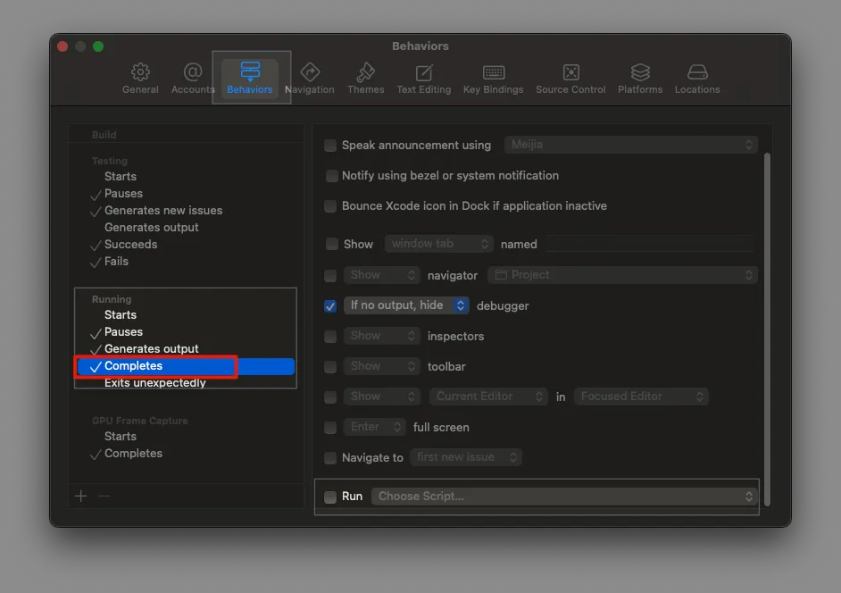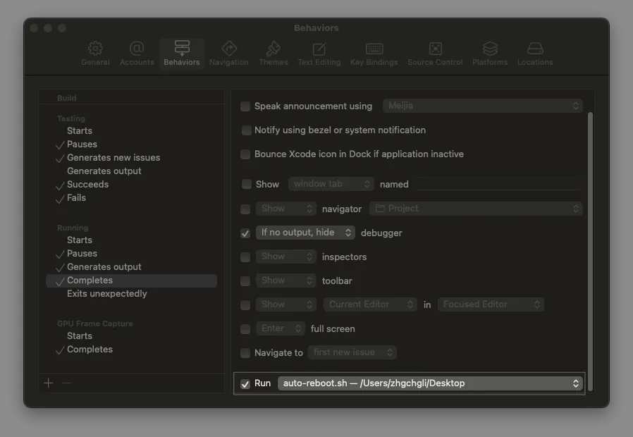 我们运用 XCode Behaviors 在 Completes (Stop or Rebuild) 的时机点重开模拟器,时间在开始 Build 之前,几乎都能在 Build -> Run 结束前完成重启。