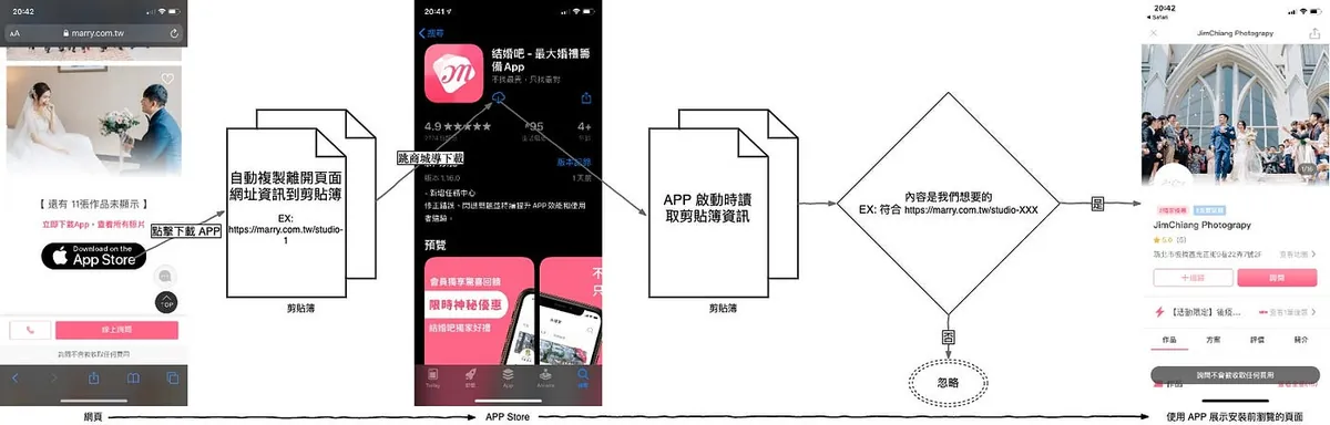 APP 打开时会读取剪贴簿主要原因是要做「 iOS Deferred Deep Link 」 加强使用者体验 ,如上流程所示;当一个产品同时提供网页及APP时,我们更希望使用者能安装 APP(因黏著度更高),所以当使用者浏览网页版网站时会导引下载 APP,但我们希望下载完开启 APP 会自动打开网页离开时的页面。