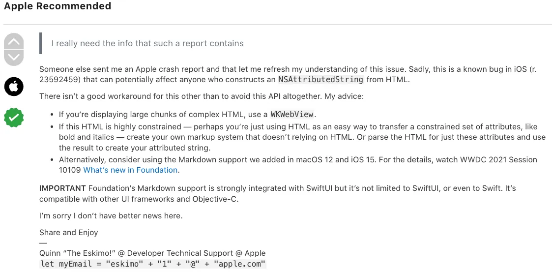 补充效能部分,实测直接使用 NSAttributedString DocumentType.html 与自行实现渲染的方式有 5~20 倍的速度差距。