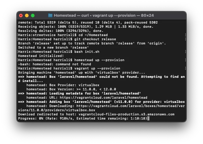 第一次启动,需要下载 Homestead 环境包,需要较长的时间。