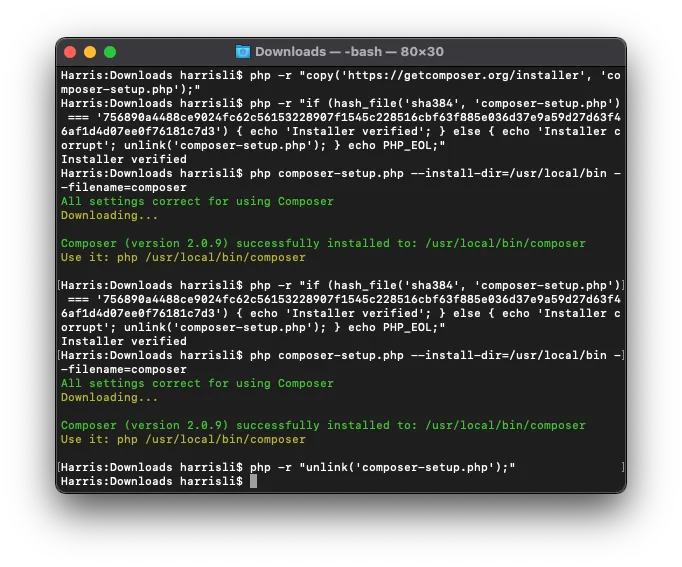php -r "if (hash_file('sha384', 'composer-setup.php') === '756890a4488ce9024fc62c56153228907f1545c228516cbf63f885e036d37e9a59d27d63f46af1d4d07ee0f76181c7d3') { echo 'Installer verified'; } else { echo 'Installer corrupt'; unlink('composer-setup.php'); } echo PHP_EOL;"