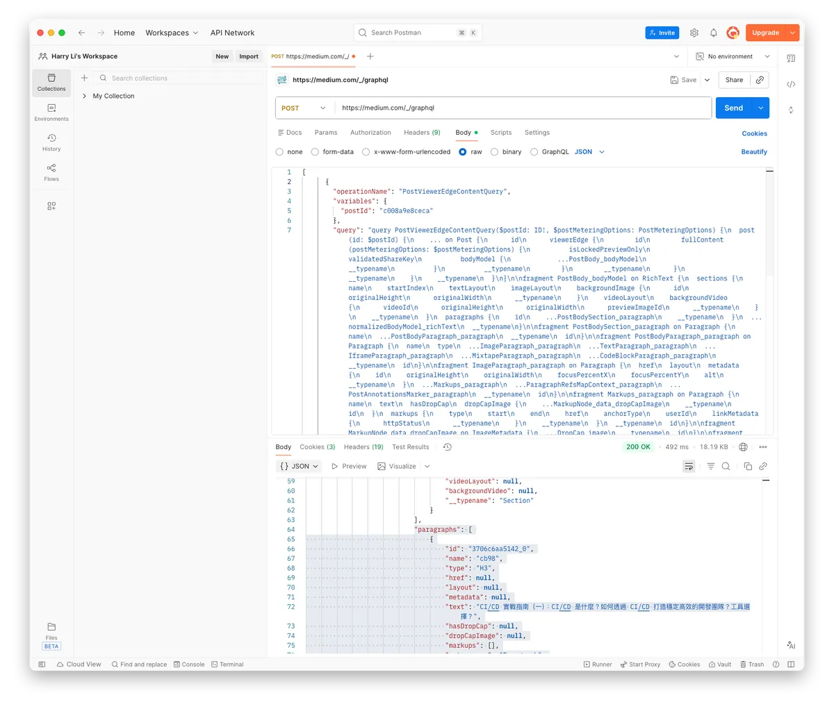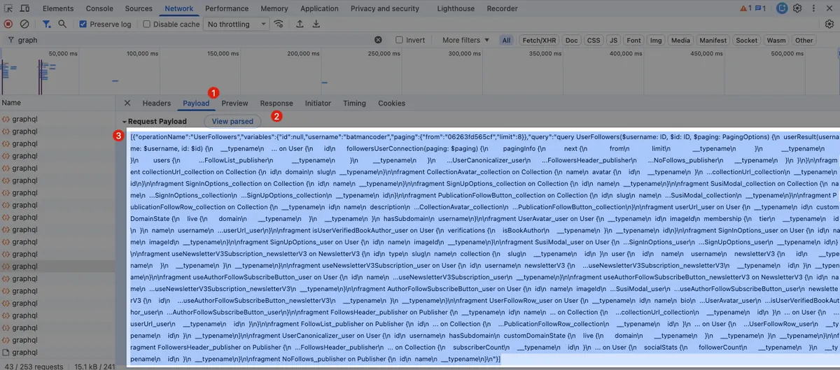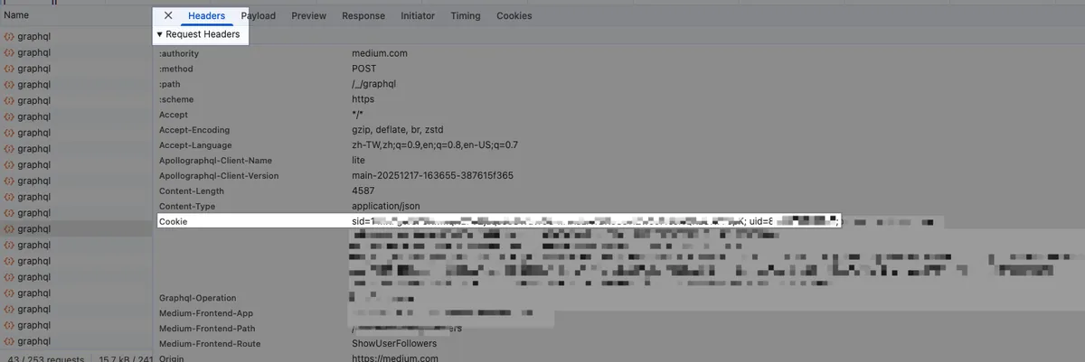 经过网路请求嗅探,我们可以发现所有的 Medium API 都是使用 https://medium.com/_/graphql 这个接口,只要我们能在自己的程式上呼叫并取得相同的资料,这条路就能达成。