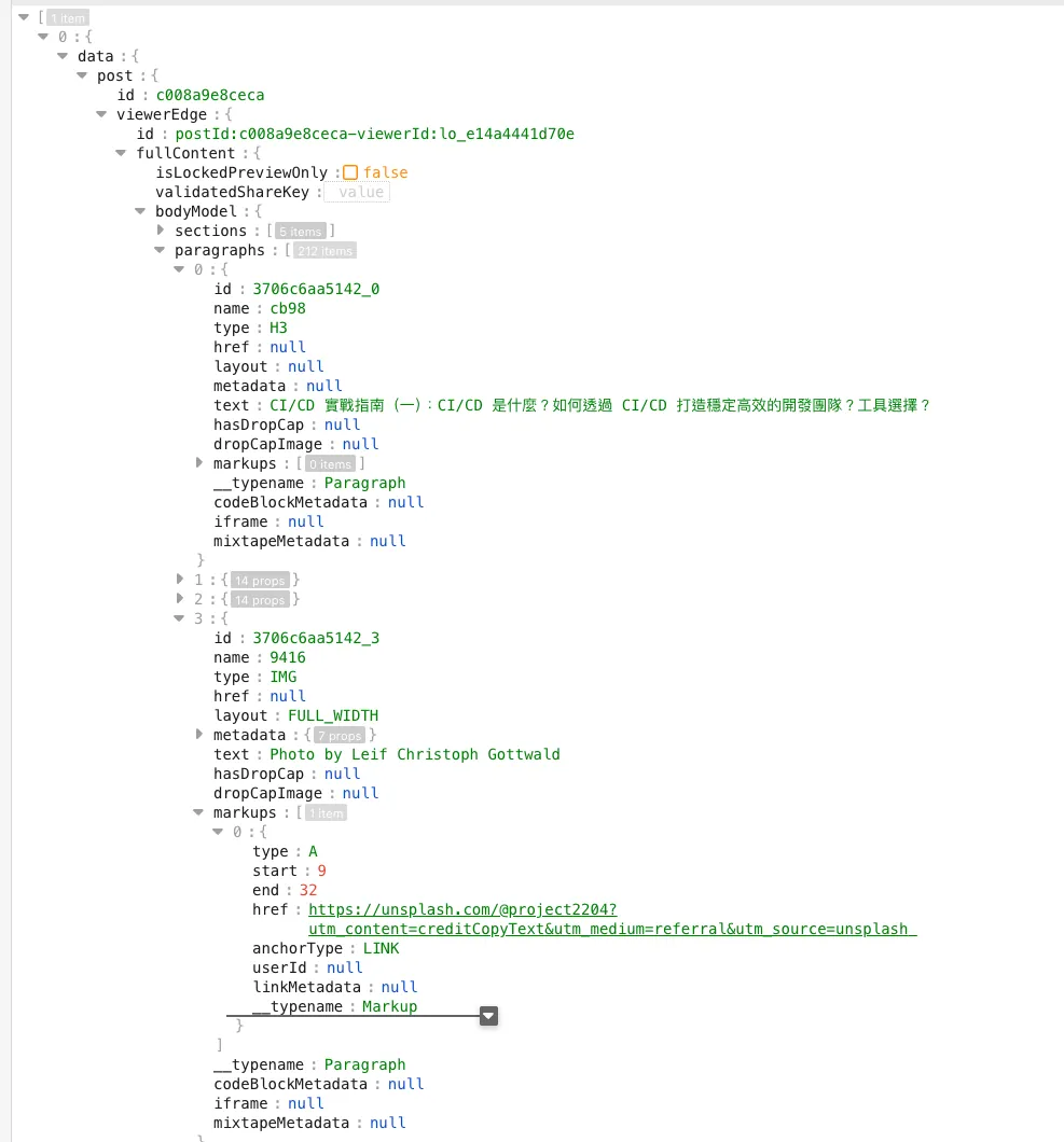 response[0]["data"]["post"]["viewerEdge"]["fullContent"]["bodyModel"]["paragraphs"]:整篇文章段落,组合起来就是全篇文章["markups"]: 段落的文字样式,例如粗体、超连结…