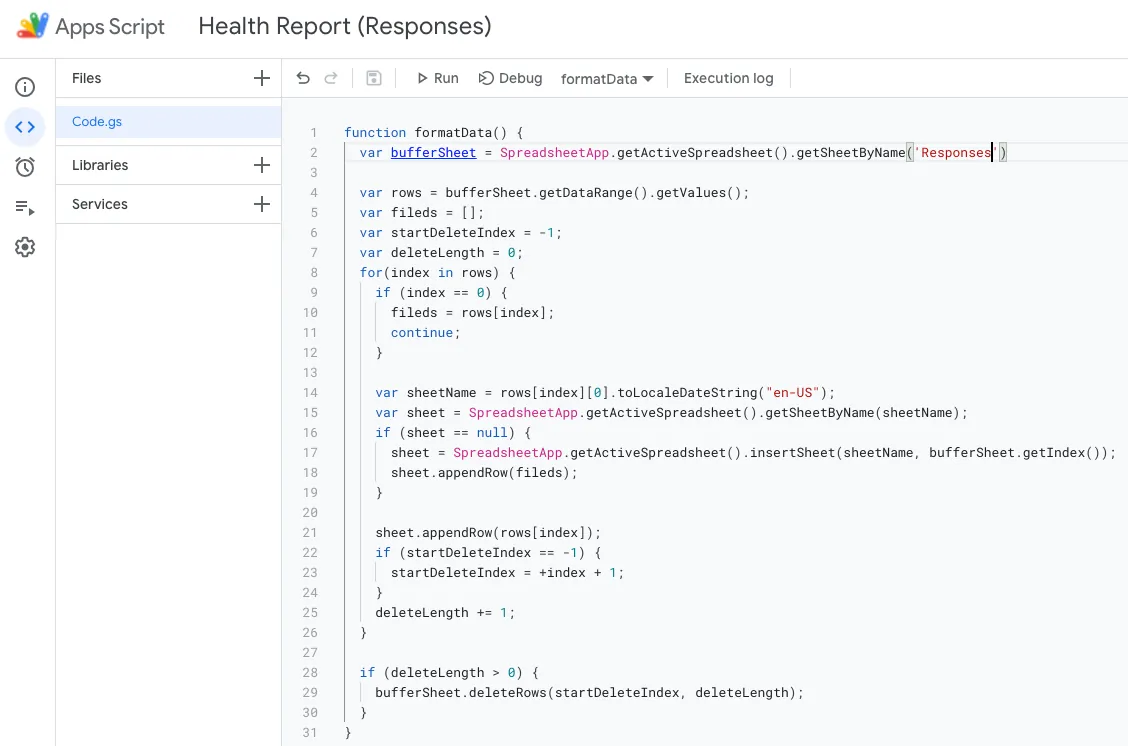 撰写 App Script Function 将 Responses 的资料依照填写日期分发到各日期的 Sheet,若无则建立新的日期 Sheet,Sheet 名称直接使用日期,方便辨识取用