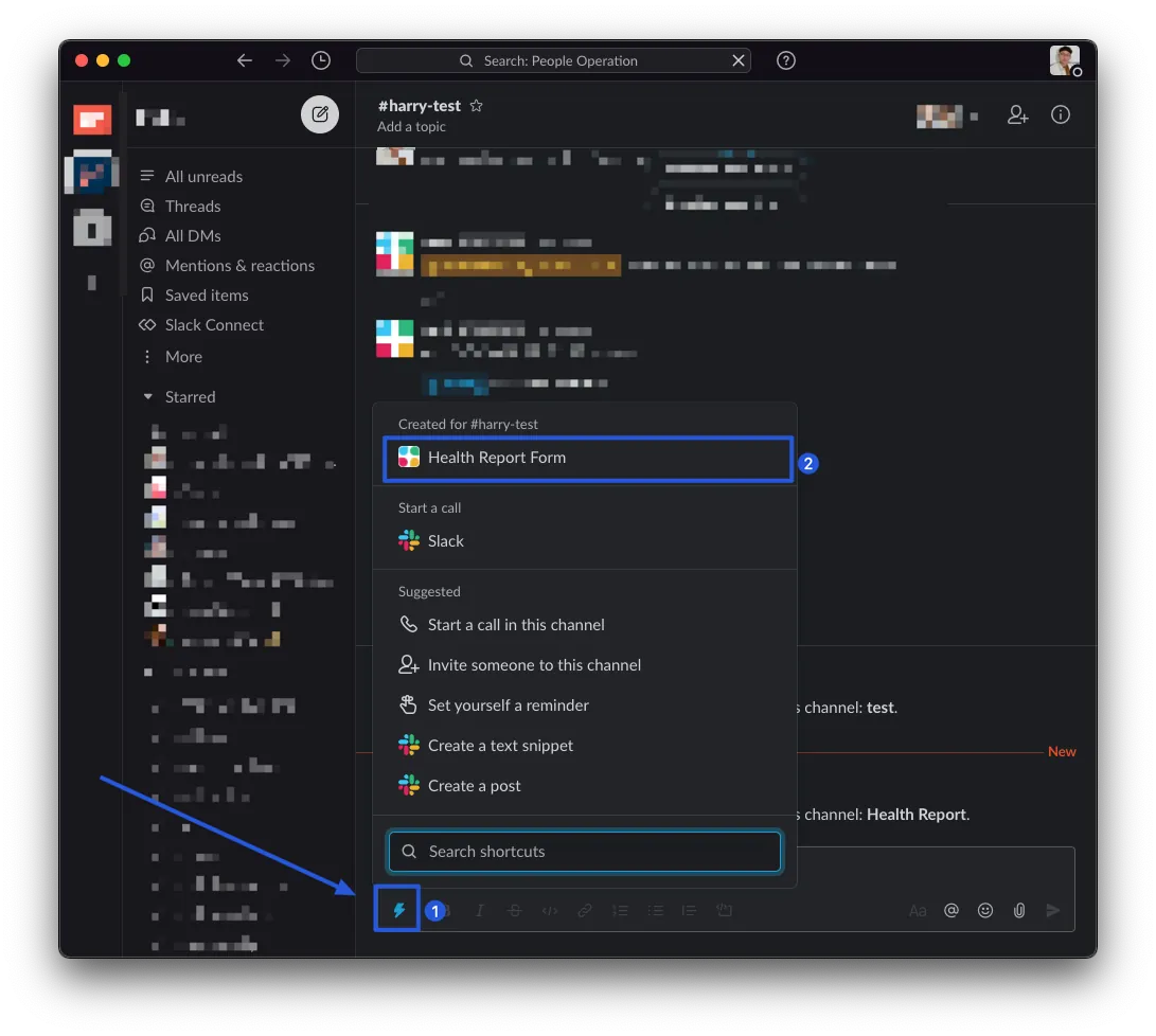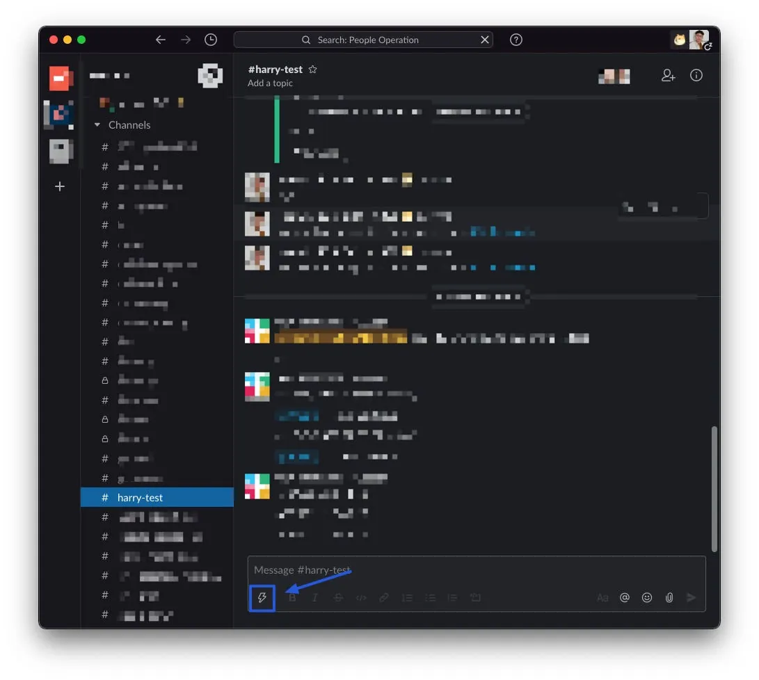 于 Slack 任意对话视窗中找到「 输入匡 下方 」的「蓝色闪电⚡️」点击下去