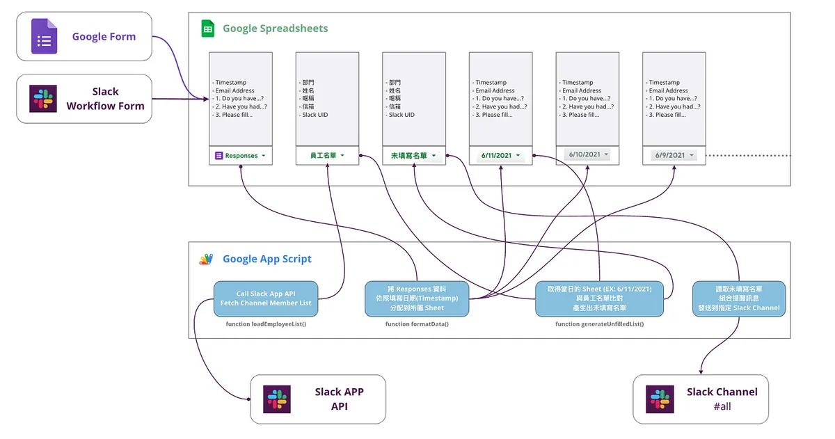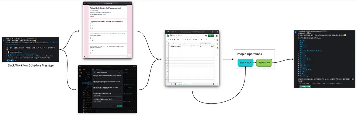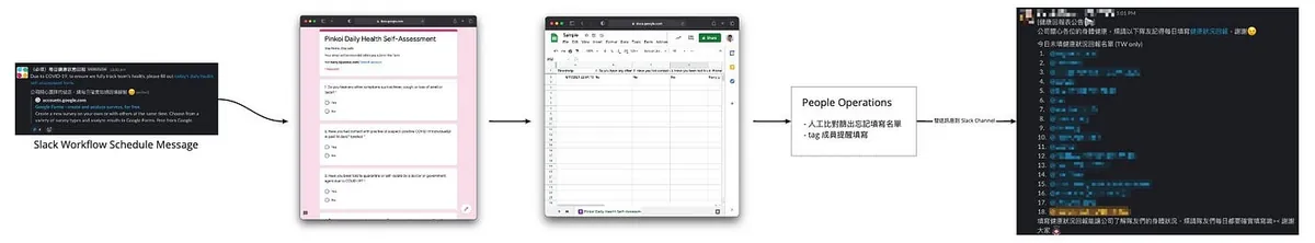以上是敝司的健康回报追踪流程,每间公司依照规模及运作方式一定有所不同,本文仅以此做为优化范例,学习 Slack Workflow 使用、基本 App Script 撰写,实际还是要 by case 实作。