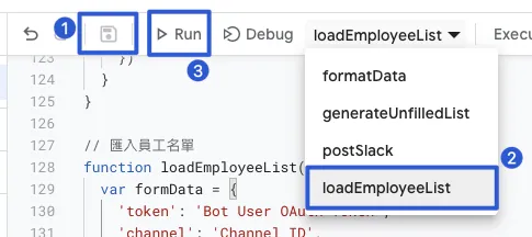 首先按「control」+「s」存档,上方下拉选单改选择「loadEmployeeList」,点击「Run」就会开始汇入名单到员工名单 Sheet。