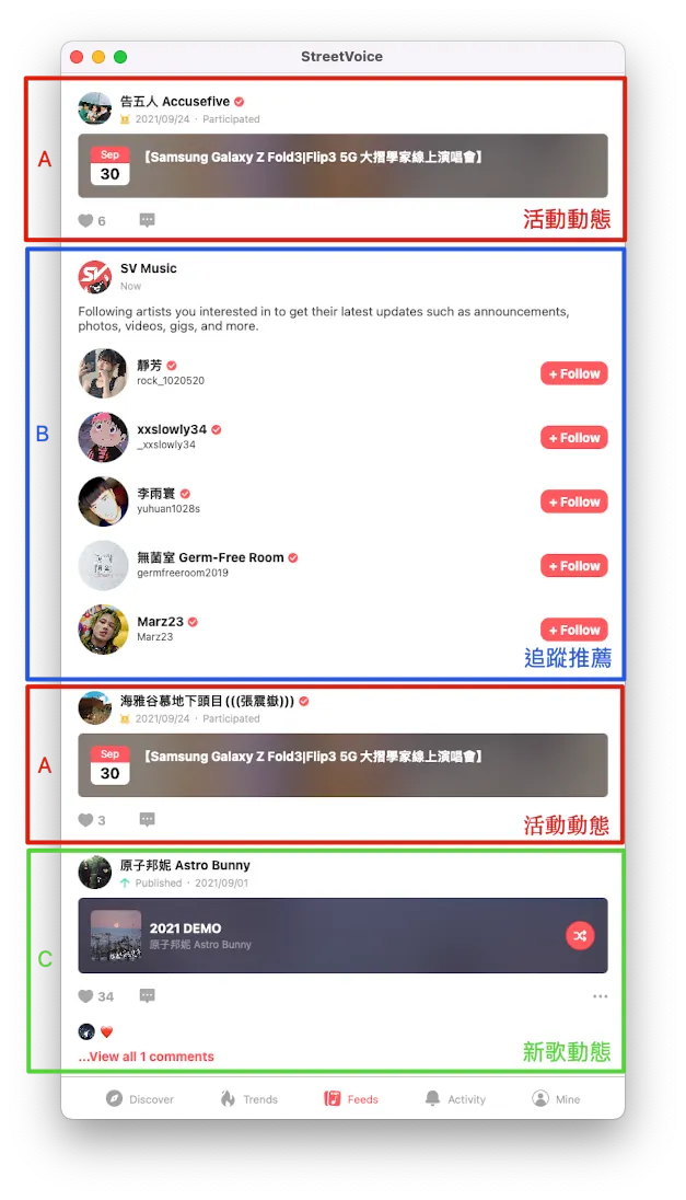 为简化 Demo Code 以下改用 PlainTextFeedViewObject 纯文字动态、 MemoriesFeedViewObject 每日回忆、 MediaFeedViewObject 图片动态,呈现设计。
