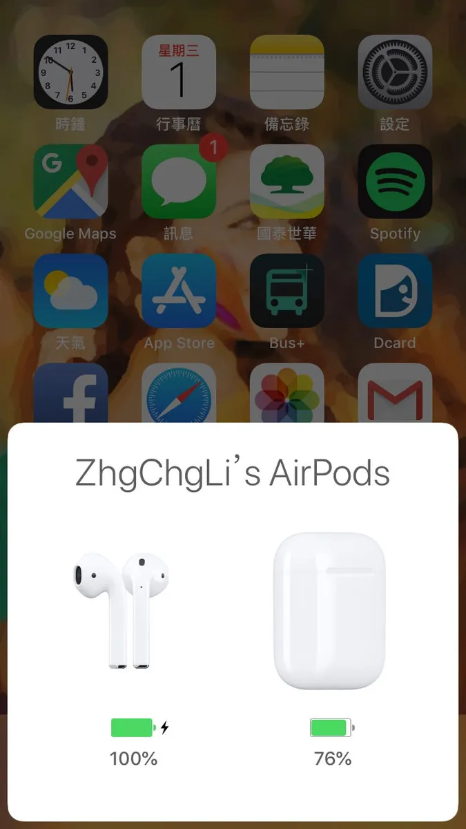 以后就能直接左滑控制中心查看AirPods电量(显示电量较低的那只的电量)要看左右耳及盒子的电量,就需将其中一只AirPods放回盒子并打开盒子(因为盒子本身没有蓝芽功能):