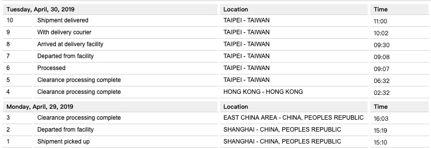 官方给的预估收到时间是:5/3~5/10,4/29通知从上海出货,很幸运地4/30赶在51劳动节放假前我就收到了(超快!!从上海到台北)