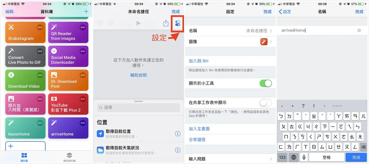 点击右上角「+」建立捷径 -> 点右上完成下方的设定按钮 -> 名称 -> 输入名称(建议用英文,因为等等还要用到)