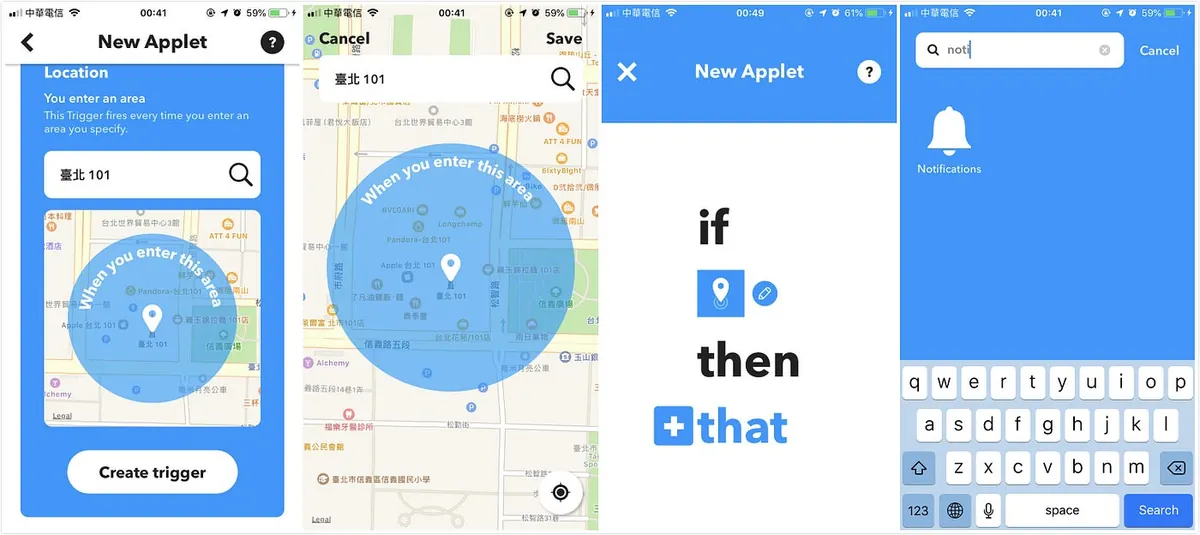 设定位置 -> 点击「Create trigger」确定 -> 换点下面「+that」-> 搜寻「notification」