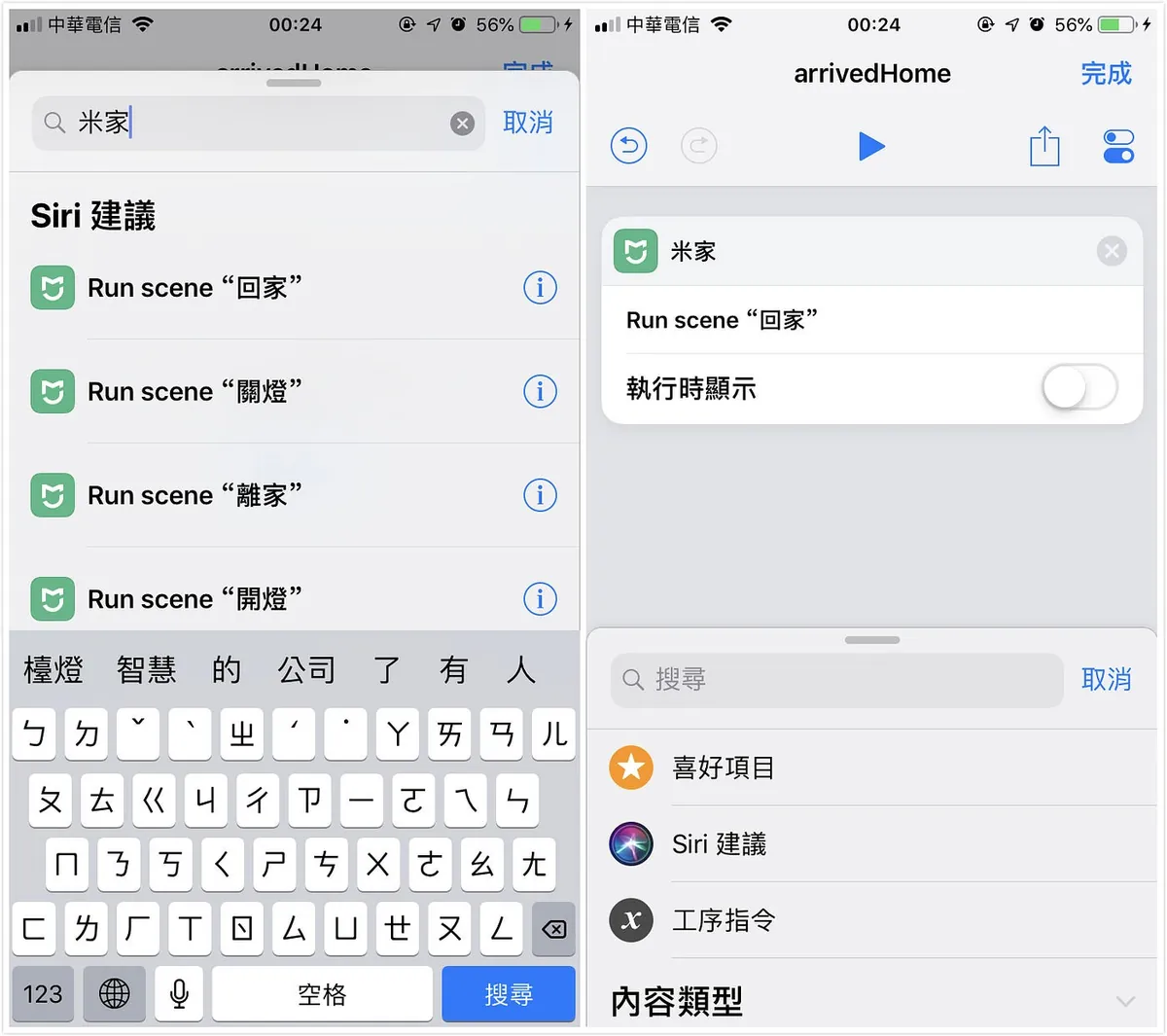 回到新增捷径页面 -> 在下方选单输入搜寻「米家」-> 加入对应的在米家设定的场景,关闭「执行时显示」否则执行完会开启米家APP。
